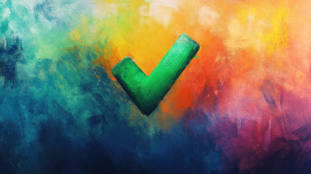 This vibrant and colorful abstract image features a bold green checkmark against a dynamic background, symbolizing success and affirmation in artistic expression.