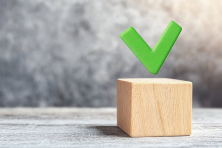 wooden cube with a green checkmark icon, symbolizing successful verification and approval.
