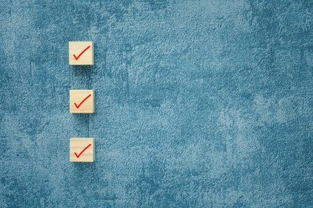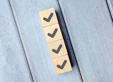 Check mark icons on wooden cube blocks