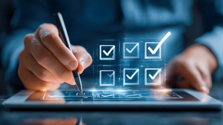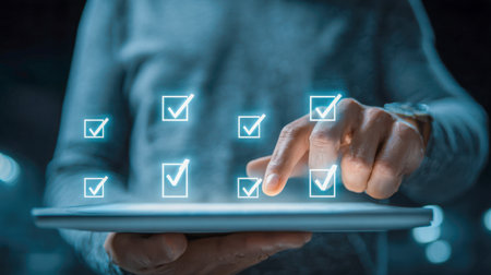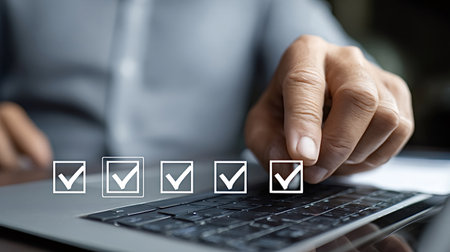 Businessman hand selects virtual checkboxes on a laptop keyboard, illustrating digital task completion, online surveys, productivity tracking and workflow management for business or personal goals