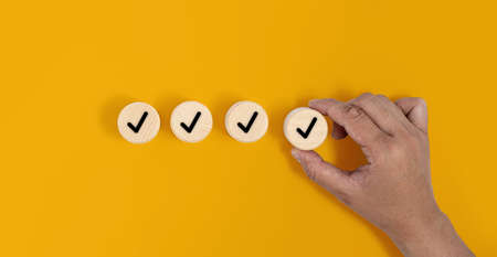 Checklist Survey and assessment concept, human hand putting cube wood with Check mark icon on wooden blocks,