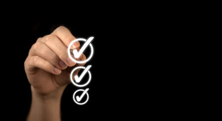 Hand marking checklist, to do and planning concept. Black background, approved mark, business photo