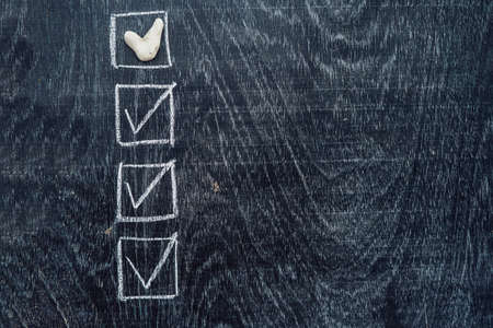 Check mark on a black wooden block. The concept of choice and making the right decision. Business management.