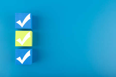 Three checkmarks on multicolored cubes in a row in the middle of bright pastel blue background. Concept of questionary, checklist, to do list, planning, business or verification. Modern minimal composition