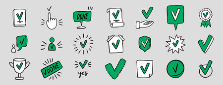 hand drawn doodle green and white colorful Set Approve Related Vector Line Icons. Contains such Icons as Protection Guarantee, Accepted Document, Quality Check. doodle. Suitable for stickers, logos,.