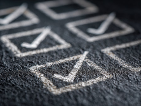 A close-up of a blackboard with hand-drawn white check marks in boxes, indicating accomplished objectives, blurred background creating a focused, motivational atmosphere.