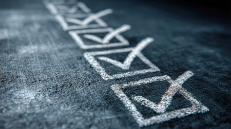 Vibrant, handwritten checkmarks inside square outlines contrast vividly against a textured dark chalkboard, creating an inspiring scene of achievement and efficient plann