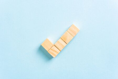 Check mark made with wooden block toys on blue background. Tick symbol. Satisfaction, agreement concept