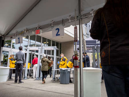 Seattle, WA USA - circa May 2021: View of people waiting in line for security checks before receiving the covid 19 vaccine at Lumen Field