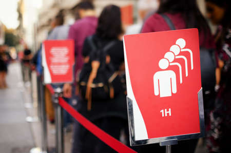 One hour waiting queue at the entrance of the Cinema Museum (Mole Antonelliana) in Turin, Italy, with tourists and waiting time signboard