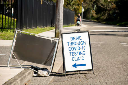 COVID-19 drive trough testing clinic sign. 2 hours wait for testing sign.