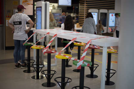 Kyiv, Ukraine - 06.24.2020: Social distance in the subway and information signs in the metro