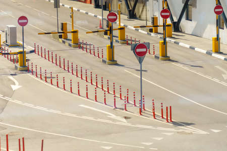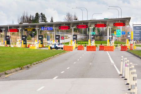 Surrey, Canada - Mar 29, 2020: Empty car lanes at Pacific Border Crossing USA entrance during Covid-19 Coronavirus shutdown, normally one of the busiest border crossings between the USA and Canada