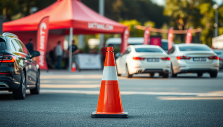 Event Setup Safety. Orange traffic cone in foreground with red event tents and parked cars in background during outdoor gathering.