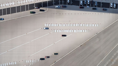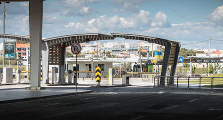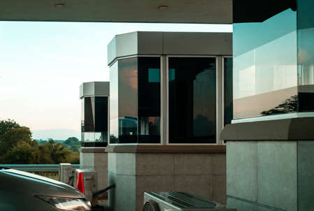 Aerial view gate for expressway fee payment in the city, toll collection point on the motorway in Italy