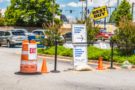 Gwinnett, County USA - 05 31 20: Best Buy covid-19 precautions in the parking lot