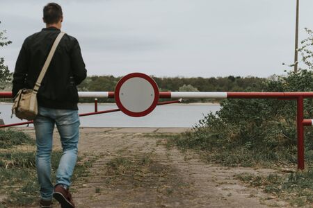 Man going into the barrier with a no entry sign . Road leads to the river.