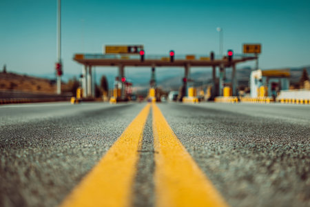 A dramatic upward perspective captures bright yellow lane markings guiding toward a toll plaza, flanked by vibrant red signals beneath a crisp, azure sky.