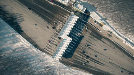 Aerial overhead shot of a big toll plaza on a toll road in winter