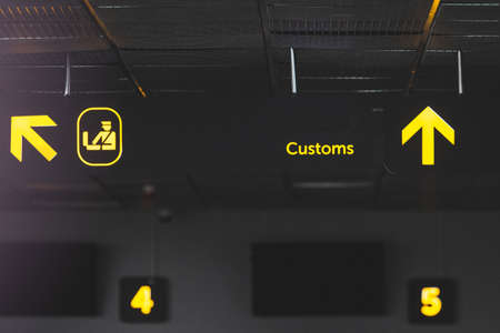 Airport informaction signs. Airport informaction signs. Arrow on information screen leading to customs