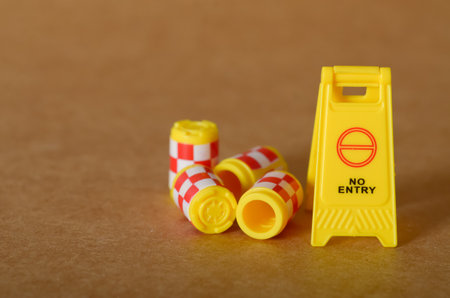 No Entry: Restricted Area with Warning Sign and Scattered Safety Barrels on the Ground.