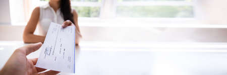 Close-up Of Businessperson Hands Giving Cheque To Other Person At Desk