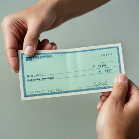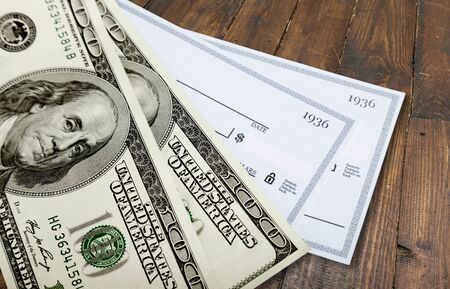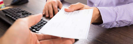 A Businessperson's hand giving cheque to customer and dollar bill, coin, laptop and graph chart on the desk at office. Payment by check, paycheck, payroll concept.
