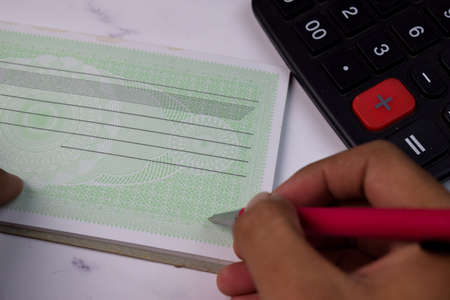 Businessman or manager hand holding pen and giving bank cheque book to the other person. Paycheck and payroll concept.