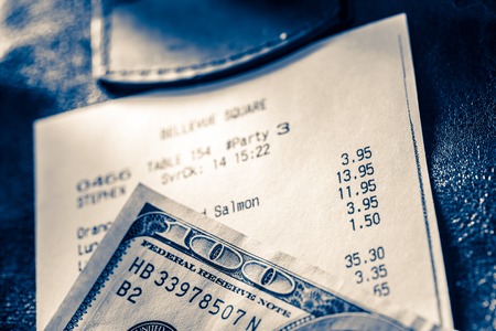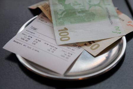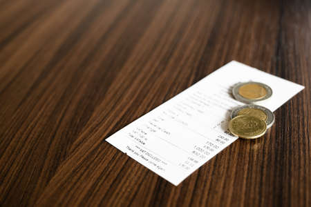 Money changes and drinks receipt on the table, bill paid with vat included, payment, and tip concept