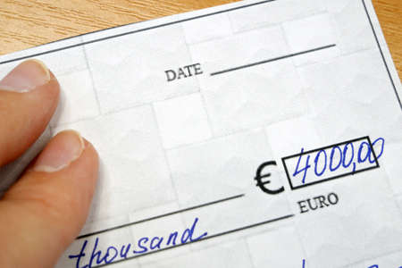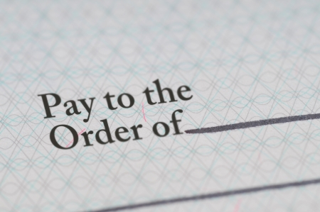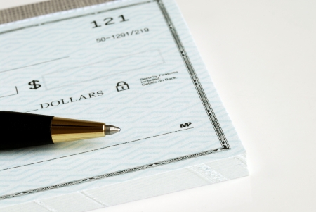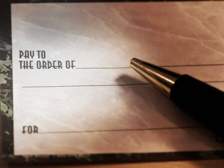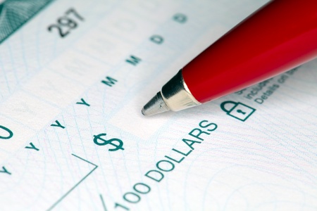 Close-up shot of a pen writing on a cheque. Shallow focus.