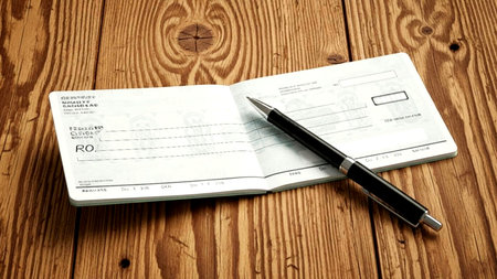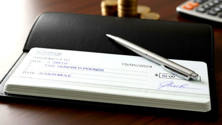 A handwritten check for five hundred pounds dated May 15, 2024, with a pen resting on an open checkbook on a wooden desk.
