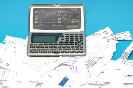 Paper bills cut out into small pieces to hide bank financial evidence next to digital diary used to record information that will be destroyed