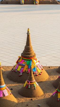 A striking vertical composition capturing the Songkran tradition of building sand pagodas. The full