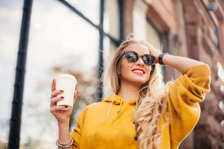 The concept of street fashion. young stylish girl student wearing boyfrend jeans, white sneakers bright yellow sweetshot.She holds coffee to go. portrait of smiling girl in sunglasses posing in the street