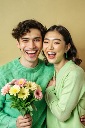 Portrait of a cheerful young couple holding flowers and looking at camera