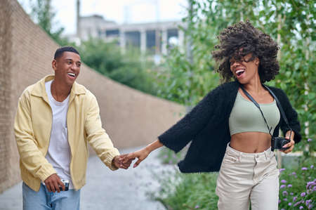 Woman and man holding hand happy running outdoors