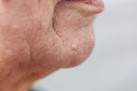 Details of senior woman face. Elderly pensioner female, chin and lips close up.
