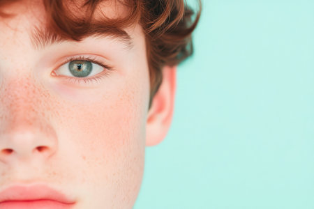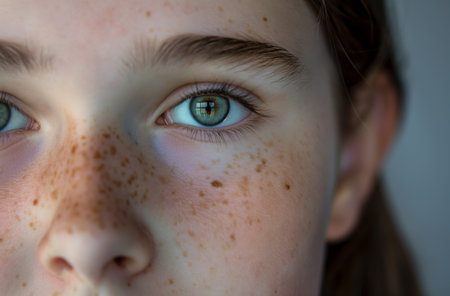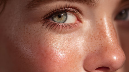 A mesmerizing close-up portrait captures the striking features of a young person with freckles, illuminating their green eye and highlighting the beauty of natural skin textures.