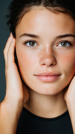 This close-up portrait showcases a young woman's serene expression, highlighting her natural beauty and unique freckles against soft lighting.