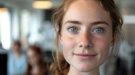 Captivating portrait of a young woman with striking green eyes and freckled skin