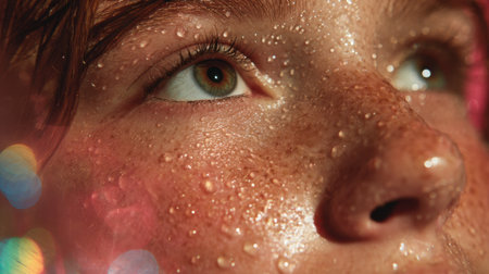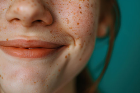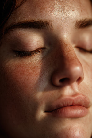 This close-up portrait captures the delicate skin features of a young woman, emphasizing natural freckles and a soft glossy finish in warm light settings.