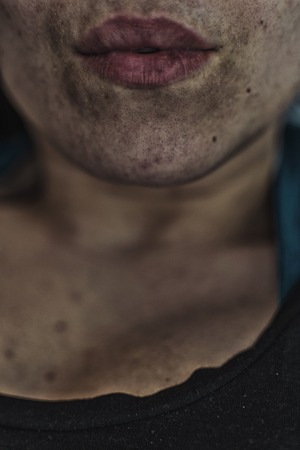 This close-up image captures the delicate texture and imperfections of a young person's skin, showcasing freckles and acne in natural light, emphasizing authenticity.