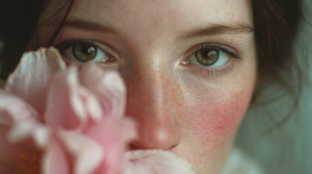 A captivating close-up portrait of a young woman with enchanting freckles, holding a delicate pink flower close to her face, engaged in a soft gaze.