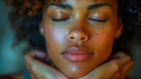 A serene woman with curly hair and closed eyes, showcasing her natural beauty and freckles