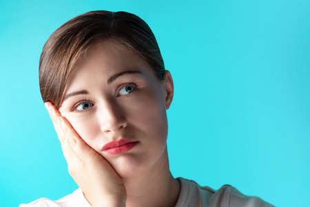 Sad girl leaned her hand to her face on blue background