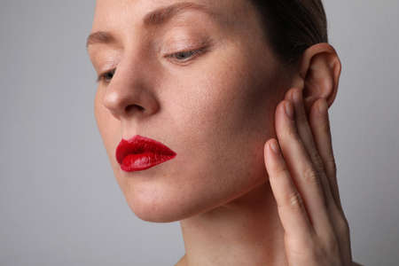 Close-up of young attractive woman with ideal skin and red lips posing indoor.