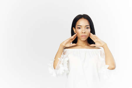 Young beautiful woman on white isolated background, plastic surgery, facial contour.