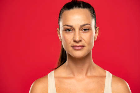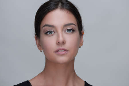 Studio beauty portrait of a young, healthy, beautiful, fresh skinned caucasian woman on a gray background