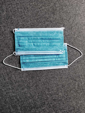 Blue medical face mask on gray background, Corona protection.