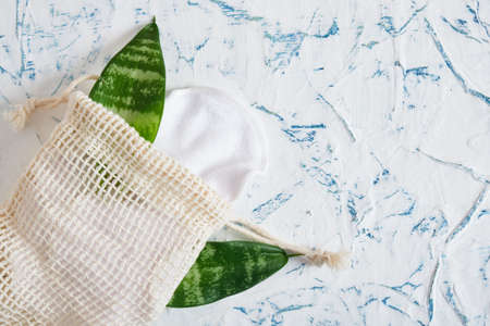 organic cotton pads on textuer background. Zero waste, reusable, eco, makeup remover and washing concept. flat lay, copy space